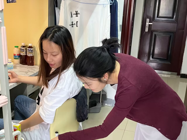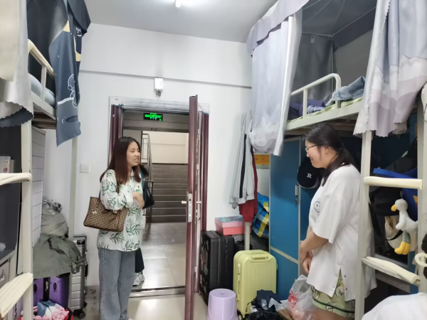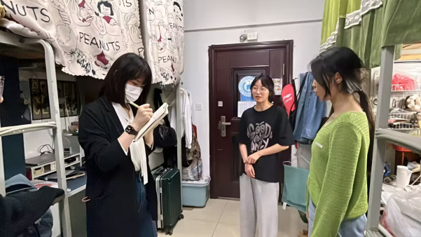 在4301寝室,胡立君董事长了解了员工曾经从役的基本情况,温情地关怀让员工敞开心扉。一名员工讲述了自己曾经当兵的日子,虽然很艰苦但也坚持下来,他感激表示公司的师生对自己平时多有关心和照顾,在课堂上难以理解的学业问题,同学们也会积极热情地帮助自己解惑。