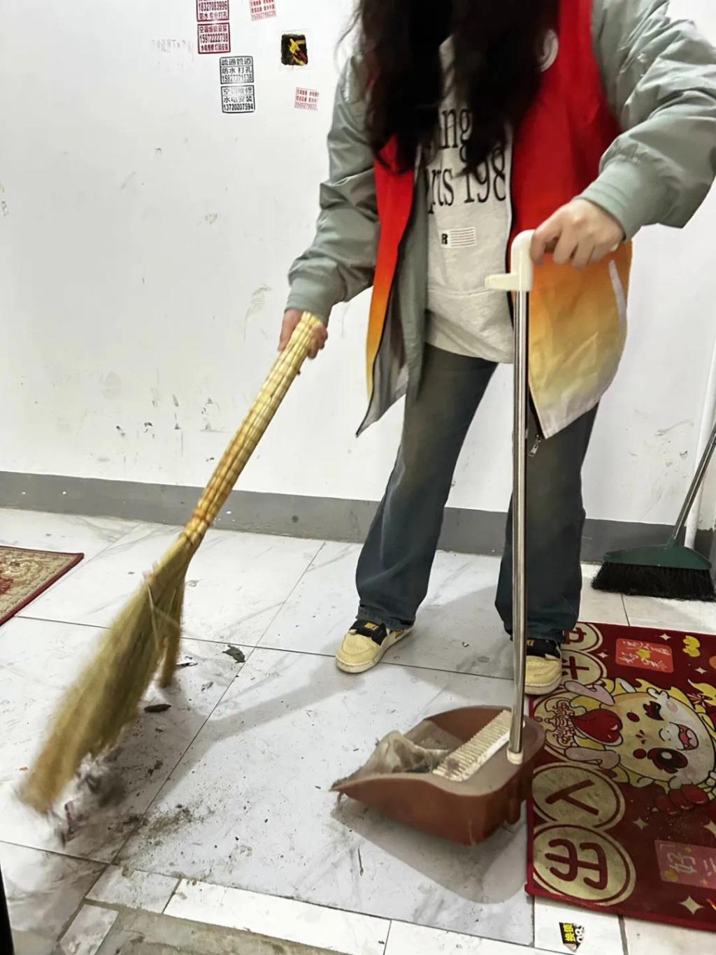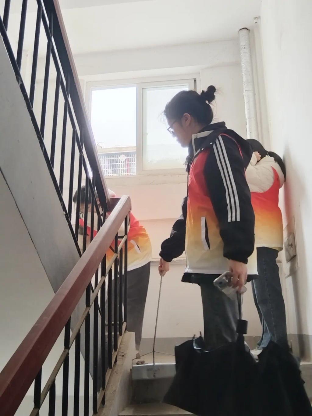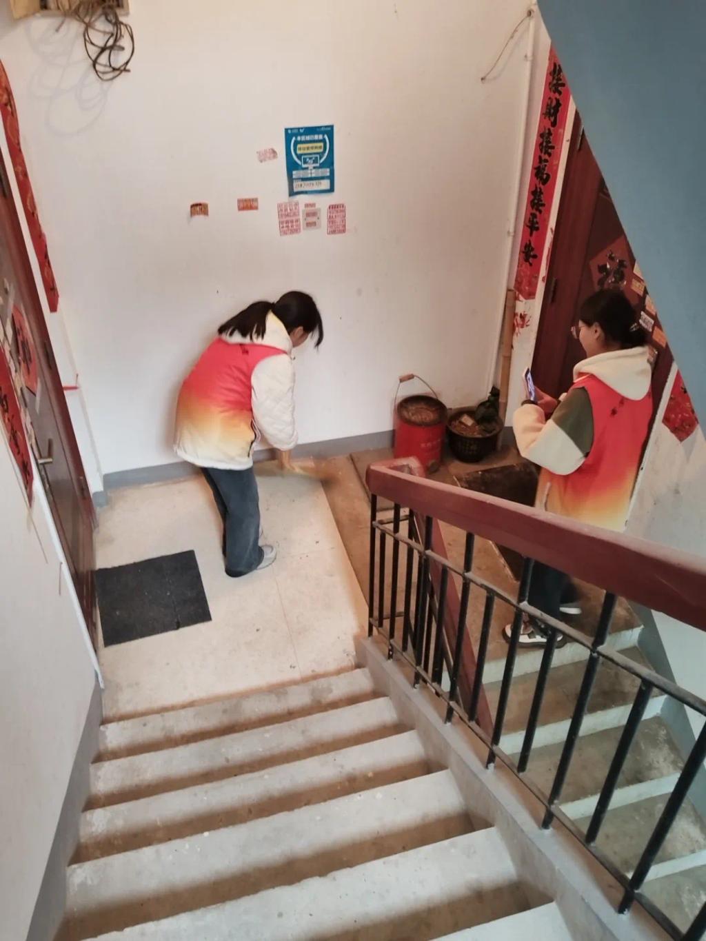 在服务过程中,志愿者们对楼道进行全面清扫,包括楼梯、扶手、门窗等区域。他们清理了楼道里的杂物,减少了消防安全隐患。小区楼道属于公共消防通道,是楼内住户日常出行的唯一通道,如果部分住户将杂物堆放在小区楼道内,影响了居民的进出通行和整体环境。当发生地震、火灾等自然灾害的时候,将严重影响他人逃生。