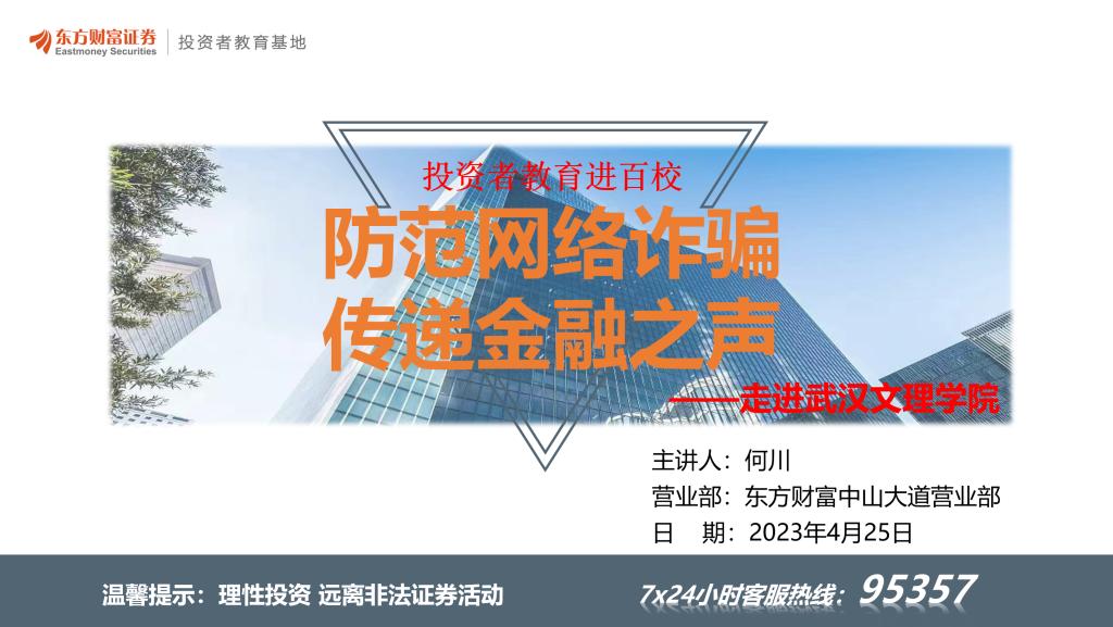 为积极响应公司关于深入学习宣传贯彻习近平新时代中国特色社会主义思想和党的二十大精神,搭建金融反诈骗产学研交流合作平台,加强对老员工金融知识的普及教育,帮助老员工掌握金融基础知识,增强金融反诈骗安全意识,提高金融素养和社会化能力,4月25日晚上,威廉希尔williamhill联合东方财富证券武汉中山大道证券营业部在4-221举办“防范网络诈骗 传递金融之声”——金融反诈知识讲座暨投资者教育进百校威廉希尔专场活动。