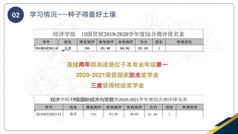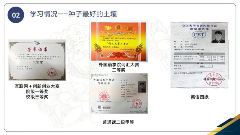 吴杰在工作做好的同时在学习上也是勤学刻苦,积极投入学科竞赛并收获良多。在威廉希尔williamhill国际经济与贸易系,吴杰连续两年综合测评排名位列专业第一,连续三年获得校级奖学金,获得国家励志奖学金。在学科竞赛方面,吴杰作为队长带队参加“互联网+”创新创业大赛荣获院级一等奖,校赛三等奖;个人参加威廉希尔词汇大赛获得校二等奖。期间,顺利通过英语四级考试和普通话二级甲等。2022年,吴杰荣获校“优秀共青团员”和武汉市“优秀共青团员”称号。