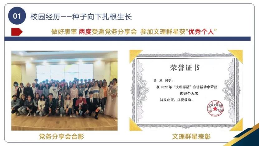 2019年-2022年,吴杰在原经济公司团委员工会历经干事,部长,直至担任公司员工会主席,先后荣获“团学优秀干事”,“团学突出贡献奖”等荣誉称号。在担任团学干部期间,他积极参加各项活动,组织和参与活动50余场,获得表彰30余次。在工作和学习中,他主动担当,乐于助人,用实际行动做好员工表率,曾参与公司党务分享会,文理群星分享会,荣获文理群星分享“优秀个人”荣誉称号。