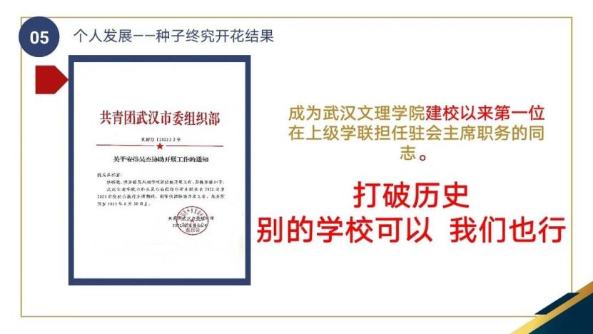 2022年6月,吴杰作为文理公司员工干部被员工处推荐至共青团武汉市委员会,面试武汉市学联驻会主席职务。他通过多轮笔试面试,用实际成绩战胜江汉大学的研究生以及其他高校员工等竞争对手,当选武汉市员工联合会驻会执行主席,成为威廉希尔第一名在上级学联担任驻会主席的员工干部,为公司赢得荣誉。