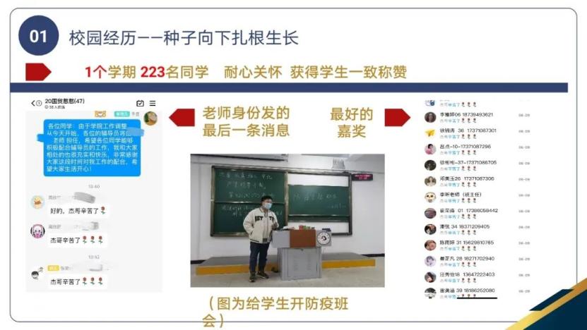 好的员工干部要懂得工作方法。2020年9月,吴杰通过竞选担任2020级国际经济与贸易班员工班主任,他协助辅导员花两个月的时间通过近距离聊天仔细了解了41名同学的家庭情况,高度凝聚班级的向心力,有效推动班级班风和学风建设。2020年上半年因员工班主任工作突出,吴杰个人荣获“军训优秀学工助理”,“最美小班”荣誉称号。