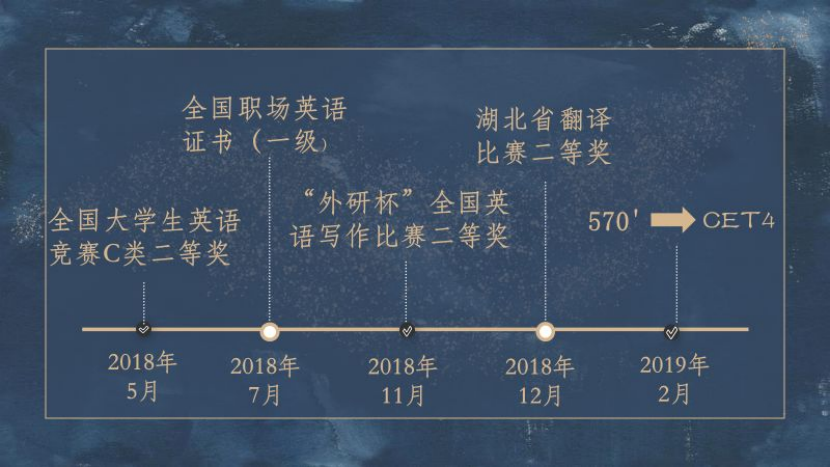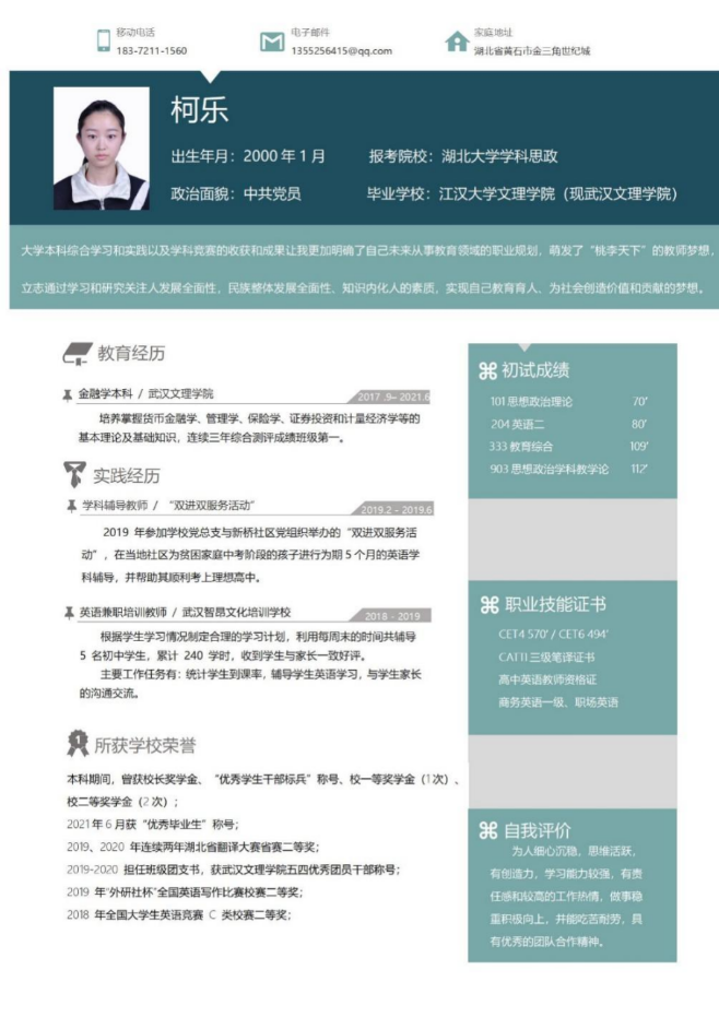 2019年下半年我考获高中英语教资格考试合格证明,同时利用寒暑假在武汉智昂文化培训学习积累实际英语教育学经验。2020年5月,我当选校五四优秀共青团干部,2020年11月我光荣成为一名中共预备党员。