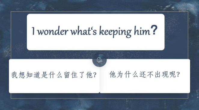 直到有一天老师给我们讲课时提到英文思维的重要性,并给了一句话让我们翻译:I wonder what's keeping him?你们看到这句话会怎么翻译呢?记得当时我看到这个句子时第一反应就是去逐字翻译,i就是我,wonder就是想知道,那么最后按照顺序依次翻译“我想知道是什么留住了他”,而最终老师给出的答案是:“他为什么还不出现呢?”老师的译文与英文原文形式上虽然不对等,但功能对应得非常好。不仅使其翻译得不刻板,又很符合我们中国人的口语习惯。这里的“为什么”虽然是一个疑问词,但也可以拆成为了什么,what keepping him和他为了什么主客相反而意思相同;原句的现在进行时和译句的“还”也是一个作用;不出现则是补述了keepping后省略的部分(from attendance) 。当时听到这句翻译时我的心里很是触动,并且开始意识到英文思维的重要性。