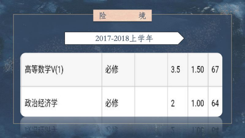 那时的我认为大学学习不过是及格与挂科的区别,秉承着“分不在多,60则行” 的坚定理念结束了大一第一学年,在英语上的学习也就这么搁置了半年。大一学年开设有政治经济学这门课程,这对于跟政治打了三年交道的文科毕业生来说似乎是捻手就来,而理科出身的我却听的特别费劲。在座有理科出身的同学不知道有没有相同的感受,当时学的寸步难行的感觉,真的是挺让人心理崩溃的。期末成绩出来后居然没有挂科,但看着这尴尬的60分却让我反思这究竟是老师的“努力”还是我的“幸运”?自此一次险境后,做了十几年的学渣的我,也决心努力去感受一下做学霸的感觉。