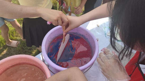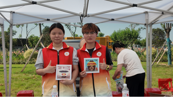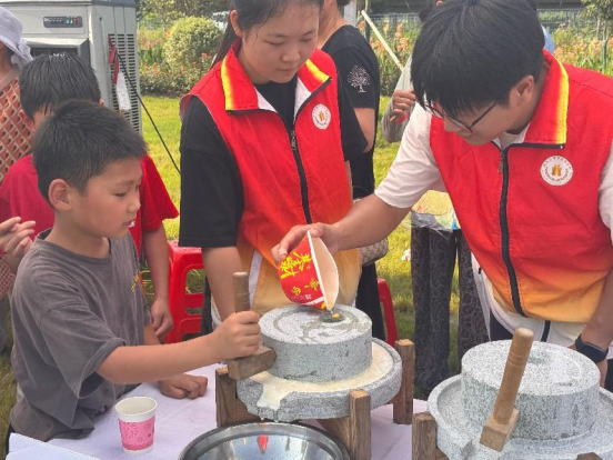 稻香盈暑月:早上七点,志愿者们就按照规定的时间起床,迅速整理好自己的内务,整装待发,八点集合完毕,准时出发前往活动现场。刚踏入活动现场,志愿者们就按照提前的分工,迅速到达各自岗位,在DIY五谷杂粮画、石磨米浆、漆扇、扎染的非遗活动中,都可以看到志愿者们有条不紊的身影。
