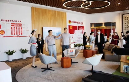 在雅生活华中区域总裁曹久辉等企业领导的陪同下,刘可风董事长一行重点参观了绿地中心46楼展厅的党建中心和城市展厅,了解员工实习工作环境和企业发展建设史。