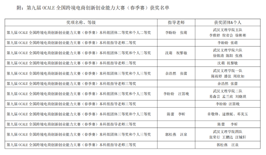 在2023年3月落幕的第九届OCALE全国跨境电商创新创业能力大赛(春季赛)中,公司威廉希尔williamhill李雅婷员工团队、徐锦涛员工团队荣获本科组团体二等奖。李盼盼、张萌、沈萌、祝黎敏等老师荣获本科组指导老师二等奖。陈雨婷员工团队、易森芸员工团队、章敬峰员工团队、张荣行员工团队荣获本科组团队三等奖。余浩然、 张蕾、李盼盼、 汪笛晚、陈蕾、李昕、郭松燕、汪泉等老师荣获本科组指导老师三等奖。