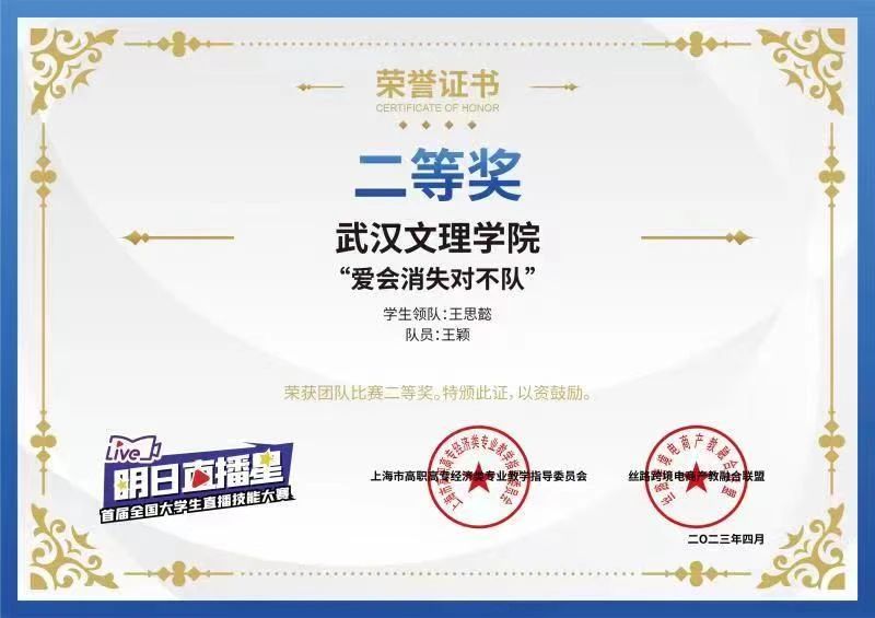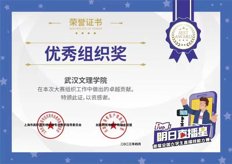 教师余浩然、李盼盼指导员工荣获抖音举办的明日直播星--首届全国老员工直播技能大赛二等奖,威廉希尔荣获该赛事优秀组织奖。陈蕾、祝黎敏老师指导员工荣获全国老员工智慧供应链创新创业挑战赛三等奖。